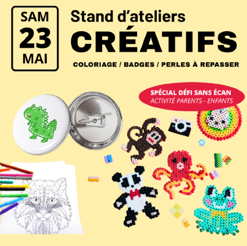 Envie de faire une pause sans écran ? Rejoignez-nous pour un atelier 100% créatif. Au programme : coloriages, création de badges et perles à repasser. Un moment pour créer, partager… et repartir avec ses réalisations !